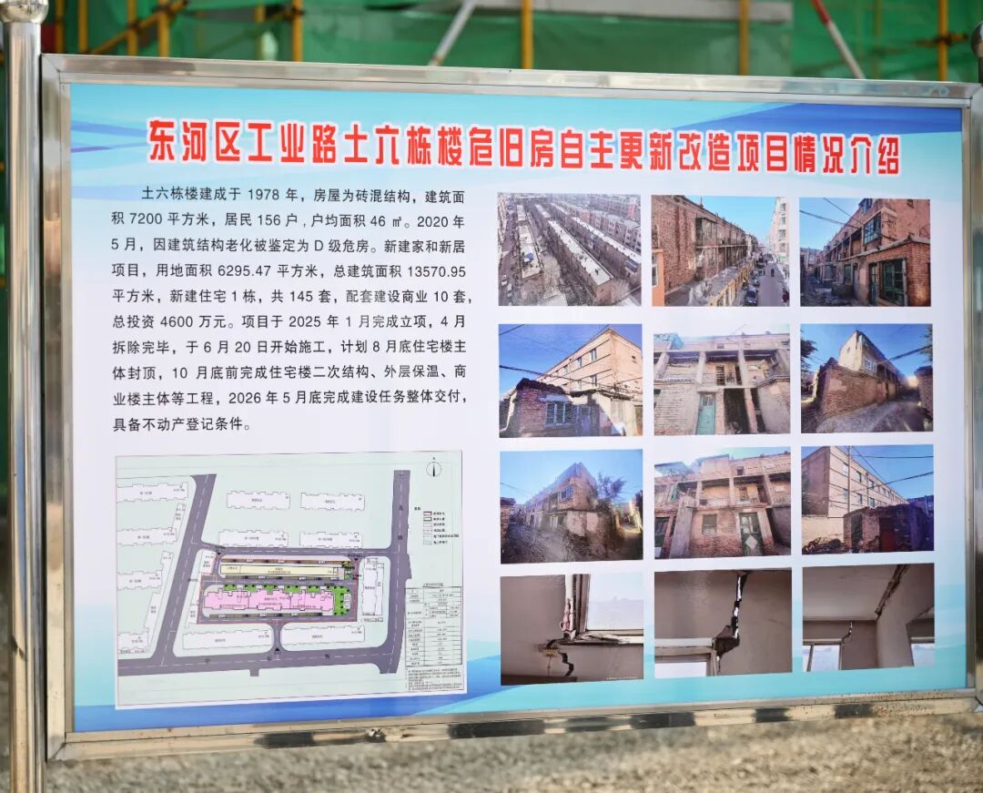地基开挖,脚手架耸立。2025年6月,土六栋楼重建工程开启。历时3个多月的建设,2025年9月完成项目封顶。