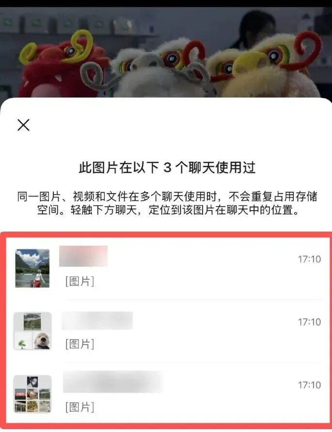 “同一图片、视频和文件在多个聊天使用时,不会重复占用存储空间。”