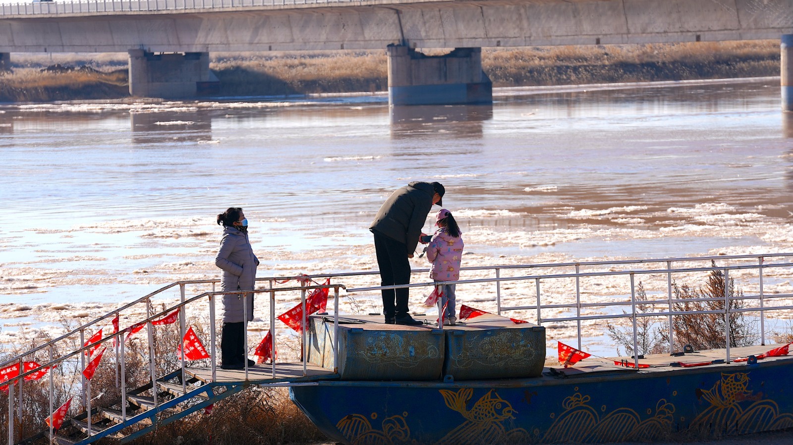 • 小朋友在家长的指导下,用手机拍摄黄河流凌美景